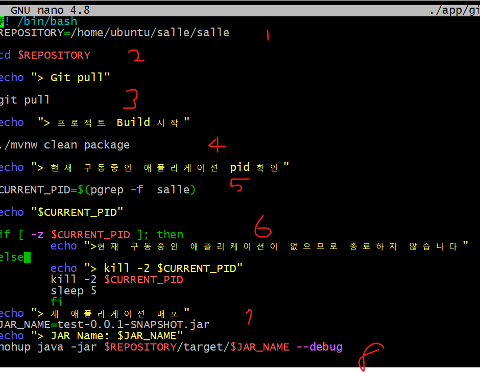 저도 Linux를 잘 모르지만 JAR파일 실행 커맨드를 shell script 파일로 만들어 모든 코드를 칠 필요없이 호출해주기만 하면 되는 것도 알게되었습니다. 아래 사진이 deploy.sh 파일인데 실행시키면 단계별로 작성한 커맨드가 실행됩니다. 자세한 건 참고자료 사이트에서 보시면 되고, 간략하게 1: Repository 치환값 생성 2: 치환자로 이동 3: Github pull(업데이트) 4: Maven build(JAR파일 생성) 5:CURRENT_PID 치환자 생성(salle란 이름으로 실행 중인 프로세스의 pid) 6: 구동중인 salle 이름으로 된 애플리케이션 수가 0인지 확인(if [ -z ...] 띄어쓰기 주의!!) -> kill -[숫자] 는 프로세스를 종료시킬 수 있는 커맨드, sleep은 스크립트 동작을 숫자 시간만큼 딜레이시킴(s:seconds, m:minutes... 커스텀 가능), 7: JAR_NAME 치환값 생성, 8: jar 파일 실행 (nohup은 명령을 백그라운드에서 실행시켜 커맨드 라인을 계속 작성할 수 있도록 도와줍니다. 또한 .out을 붙이면 로그를 저장하는 파일을 생성해줍니다. 이를 통해 오류나 디버깅을 확인할 수 있습니다.)