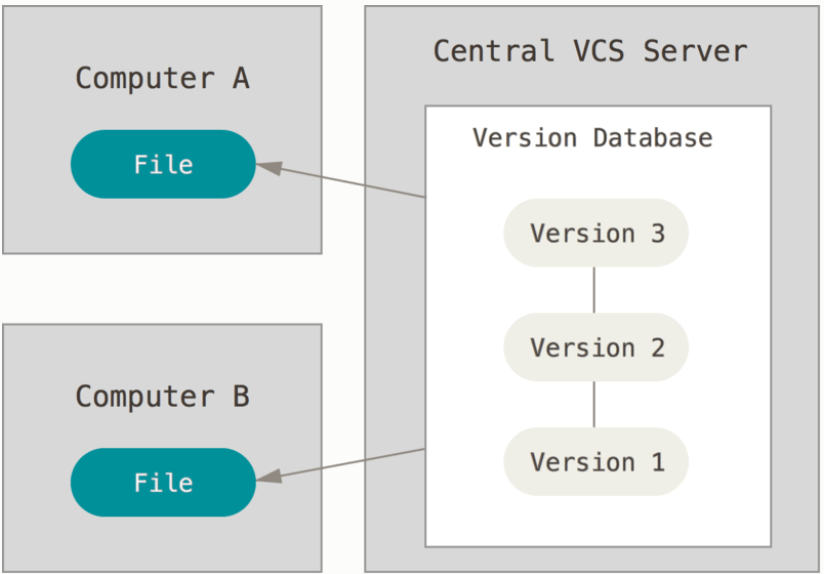 수년간 형상관리 표준이 된 시스템인 CVCS는 다른 시스템들에서 개발한 파일들을 관리하기 위해 개발되었습니다. CVCS는 버전 파일들이 담긴 단일서버를 가지고 있고 여러 사용자들이 서버로부터 파일들을 체크아웃 할 수 있습니다.