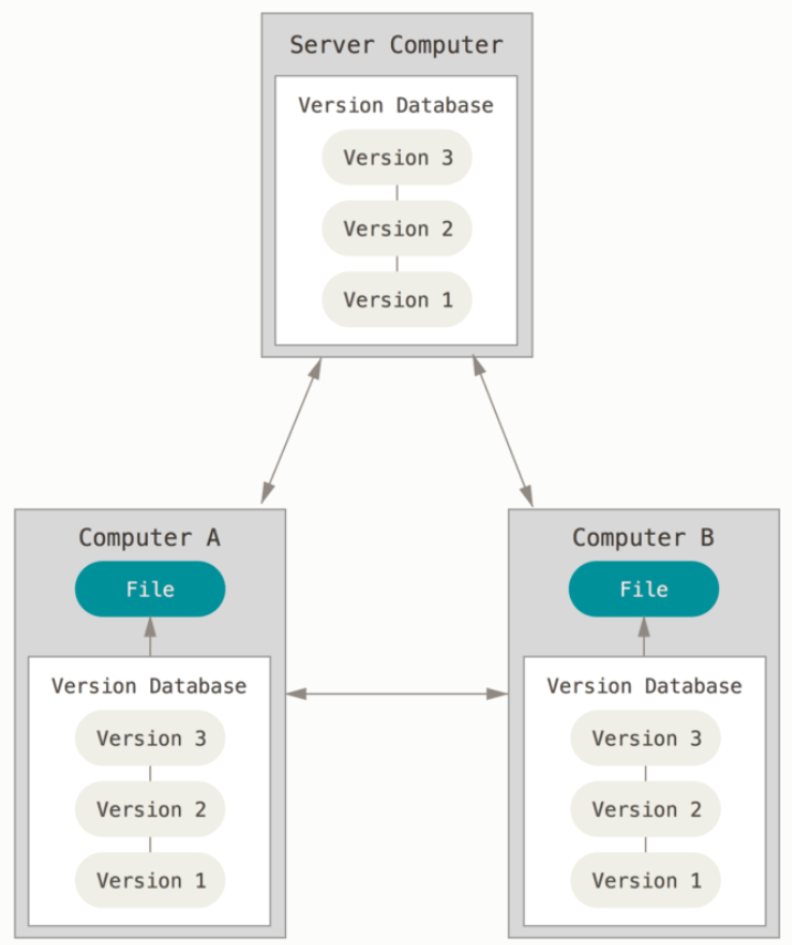 DVCS(Git, Mercurial, Bazaar, Darcs)는 CVCS와 달리 사용자들은 최신 스냅샷만을 체크아웃 하지 않습니다. 대신 모든 변경 기록들이 포함된 레퍼지토리 전체를 체크아웃 합니다. 그래서 만일 서버 장애가 생긴대도 사용자들이 클론한 레퍼지토리 중 어떤 것이든 서버를 복구하기에 충분한 백업 파일이 됩니다.