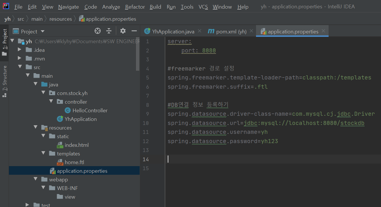 server port 번호나 freemarker 경로, DB연결 정보 등록과 같이 설정들을 bean으로 만들어주는 곳이다. 처음에는 화면이 비어있고 필요할 때마다 채워주면 된다. Spring Legacy에서 Servlet-config.xml 에 생성하는 <bean> 태그와 비슷한 역할을 하는 것 같다.