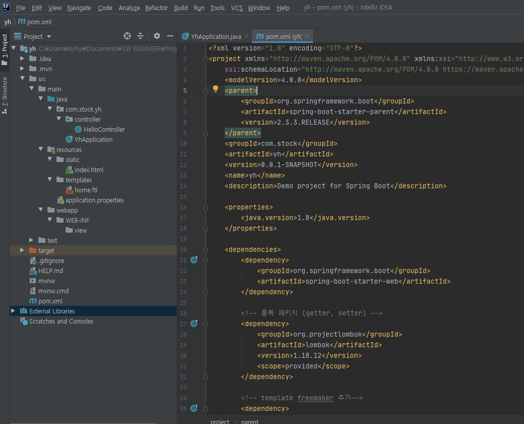 아래 캡쳐 화면 우측의 Dependencies는 내가 쓸 Library이며, 이들은 Framework 생성 시 자동 장착 돼있다. Lombok은 setter, getter 아노테이션으로 편리성을 더해준다. Spring Web은 웹 어플리케이션을 구현할 거라면 필수로 의존설정 해줘야 되고 Apache Freemarker는 템플릿 엔진으로 자바 객체에서 데이터를 생성해서 템플릿에 넣어주면 freemarker가 템플릿에 맞게 변환해 HTML을 만들어 준다. 나머지 2개는 DB 연동을 위한 MySQL, MyBatis library다. DB연동 dependency는 글의 맨 아래에 설명돼있다.