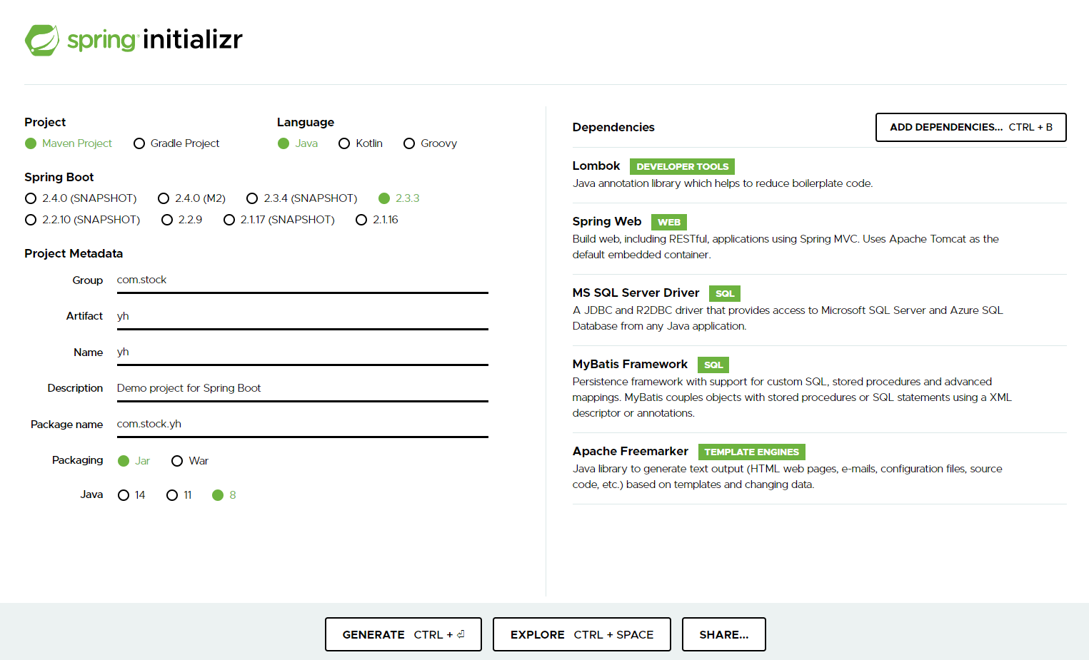 Spring Boot 버전은 크게 상관없다. default 2.3.3 버전을 썼다. Group ID는 URL을 거꾸로 써주는 게 관례이다. yh.stock.com을 거꾸로 해서 지었다. Description은 연습용이니 default 값 그대로 놔뒀고, Packaging은 Jar밖에 모르기 때문에 그대로 썼다. Java 버전은 8버전, 혹시 버전 확인이 필요하다면 window키 + R 을 눌려 cmd를 검색한 뒤 명령 프롬프트 창에 java -version을 치면 볼 수 있다. (ex. 1.8.0_261 -> 8버전)